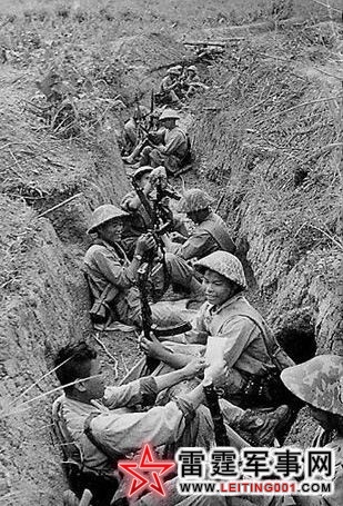 奠边府战役中,越南人民军正在一条老(挝)越(南)边境围绕法军要塞的一战战壕里休整,不难看出他们使用是“波波莎”冲锋枪,戴的头盔和东德人民军的也颇为相似。(1954)