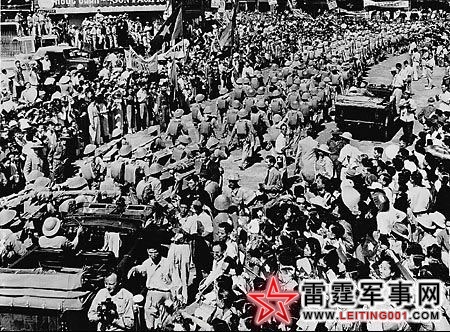 签定《日内瓦和平协定》后,法国结束其在越南的殖民统治,随后越南人民军浩浩荡荡开入河内,河内居民夹道欢迎。(1954)
