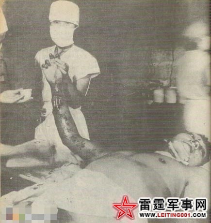 南温河第一野战医疗所战士齐常富被越军地雷炸伤双腿和右臂的惨状。被抬上手术台时,大睁双眼在半昏迷状态中无限痛苦地向医护人员说:“……我能坚持住。”