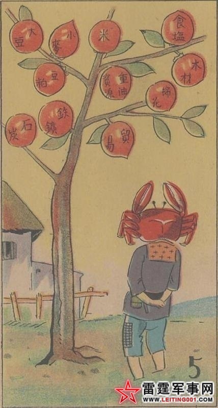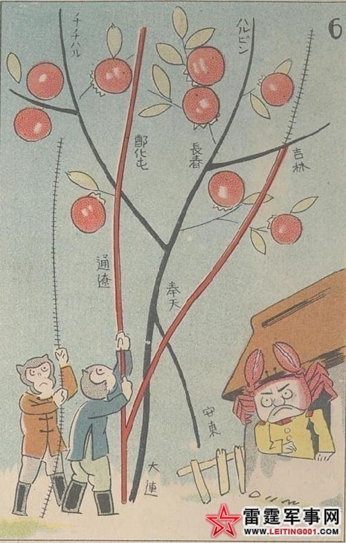7)猴子(中国)为了夺取这些硕果,用竹竿(中国在日本控制的“满洲铁路”的外围自建铁路)敲打树上的柿子。(中国人在自己土地上修铁路居然被说成侵犯日本权益。)